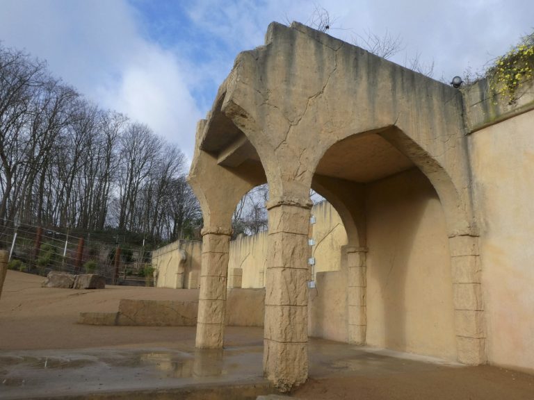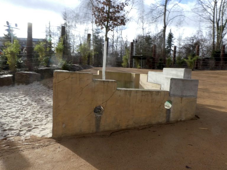 Auch im Außenbereich ist die Veränderung spürbar. Durch den teilweisen Abtrag des alten Begrenzungshügels hat sich die Fläche auf 1.100 qm fast verdoppelt. Optisch bleibt der Zoo seiner Linie treu: Ein kunstvolles Aquädukt in Ruinenform fügt sich in das indische Design des Tempelpalasts ein. Es ist jedoch weit mehr als Deko: Es dient als Schattenspender und integriert eine Wasserstrahldusche für die Abkühlung an heißen Tagen.