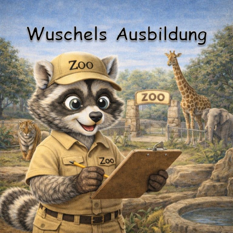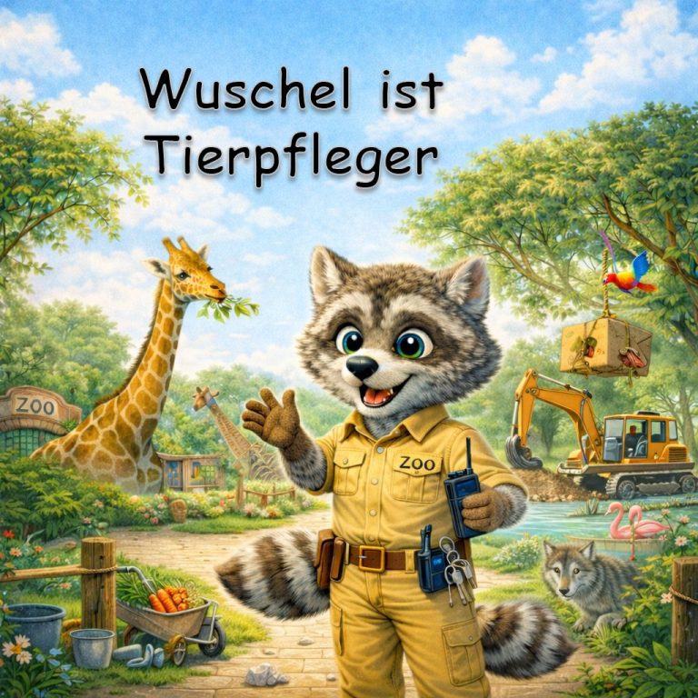 „Endlich ist es so weit: Wuschel trägt mit Stolz seine Arbeitskleidung und ist nun ein echter Tierpfleger. Vom frühen Morgen an kümmert er sich liebevoll um seine Schützlinge, bereitet Futter vor und sorgt dafür, dass es jedem Tier im Zoo an nichts fehlt. Für Wuschel ist es weit mehr als nur ein Job – es ist seine Berufung, jeden Tag die Welt seiner tierischen Freunde ein Stückchen besser zu machen.“